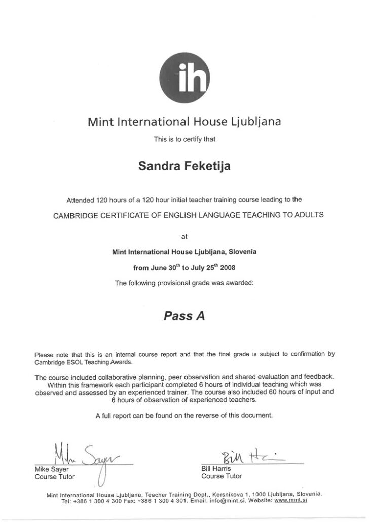 4-tedensko intenzivno usposabljanje za poučevanje odraslih in certifikat CELTA (Certificate in